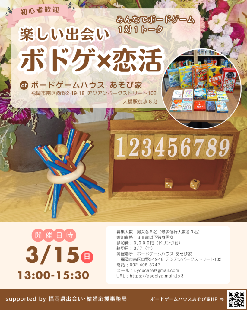 【イベント】3月15日(日) ボドゲ×恋活 at ボードゲームハウスあそび家 参加募集中