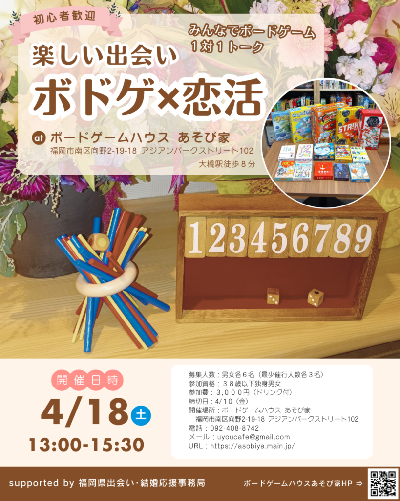 【イベント】4月18日(土) ボドゲ×恋活 at ボードゲームハウスあそび家 参加募集中